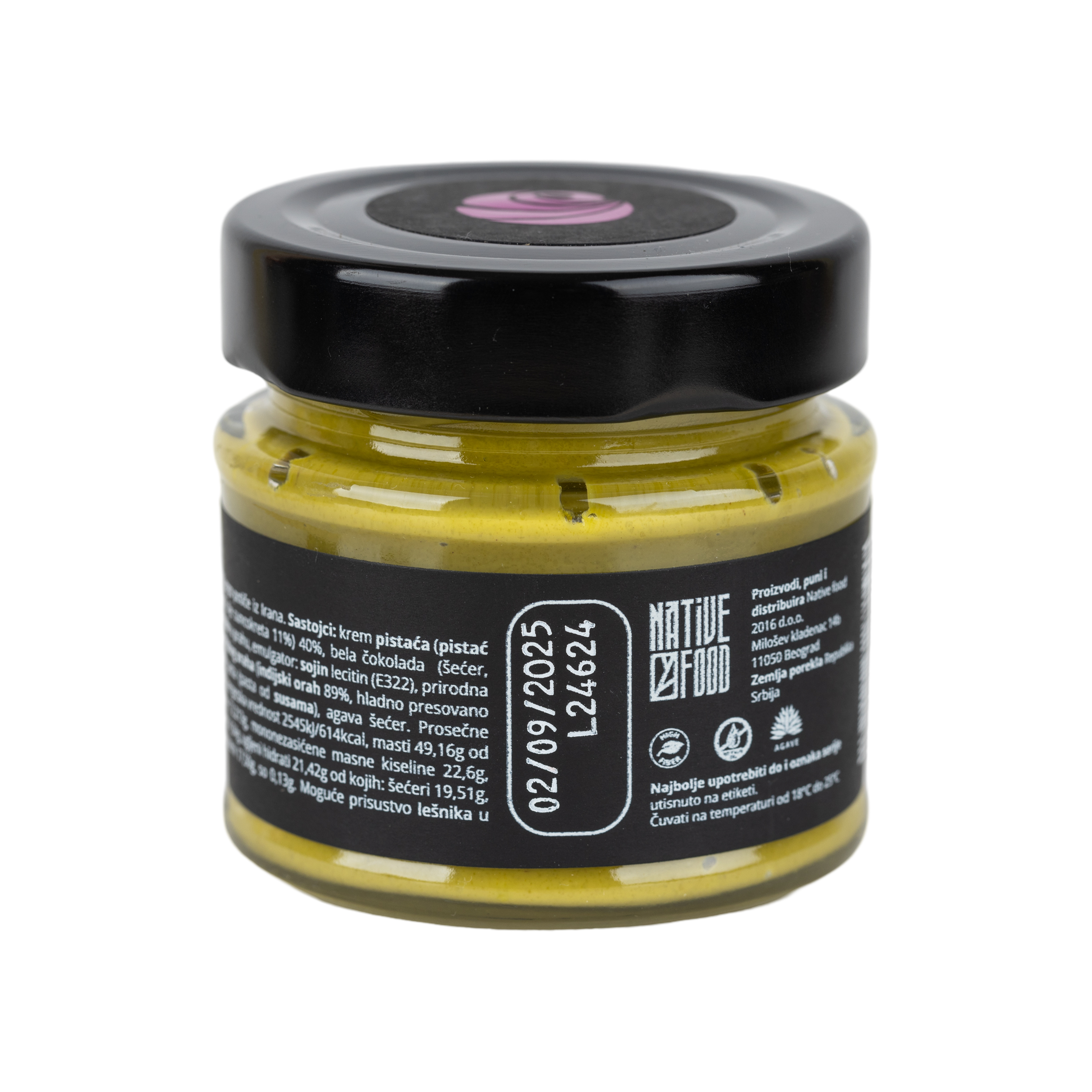 Krem pistaća (pistać jezgro 89%, hladno presovano ulje suncokreta 11%) 40%, bela čokolada (šećer, kakao maslac, punomasno mleko u prahu, emulgator: sojin lecitin (E322), prirodna aroma: vanila) 26%, krem indijskog oraha (indijski orha 89%, hladno presovano ulje suncokreta 11%), tahini pasta (pasta od susama), agava šećer.